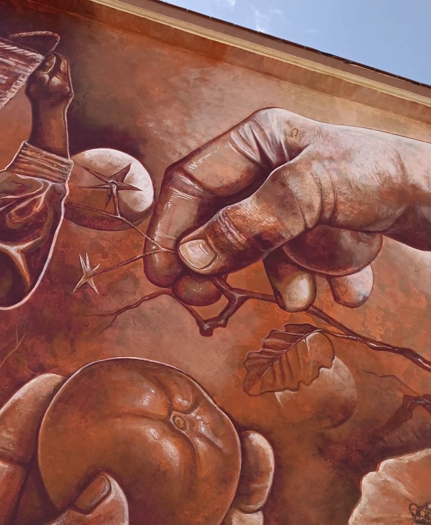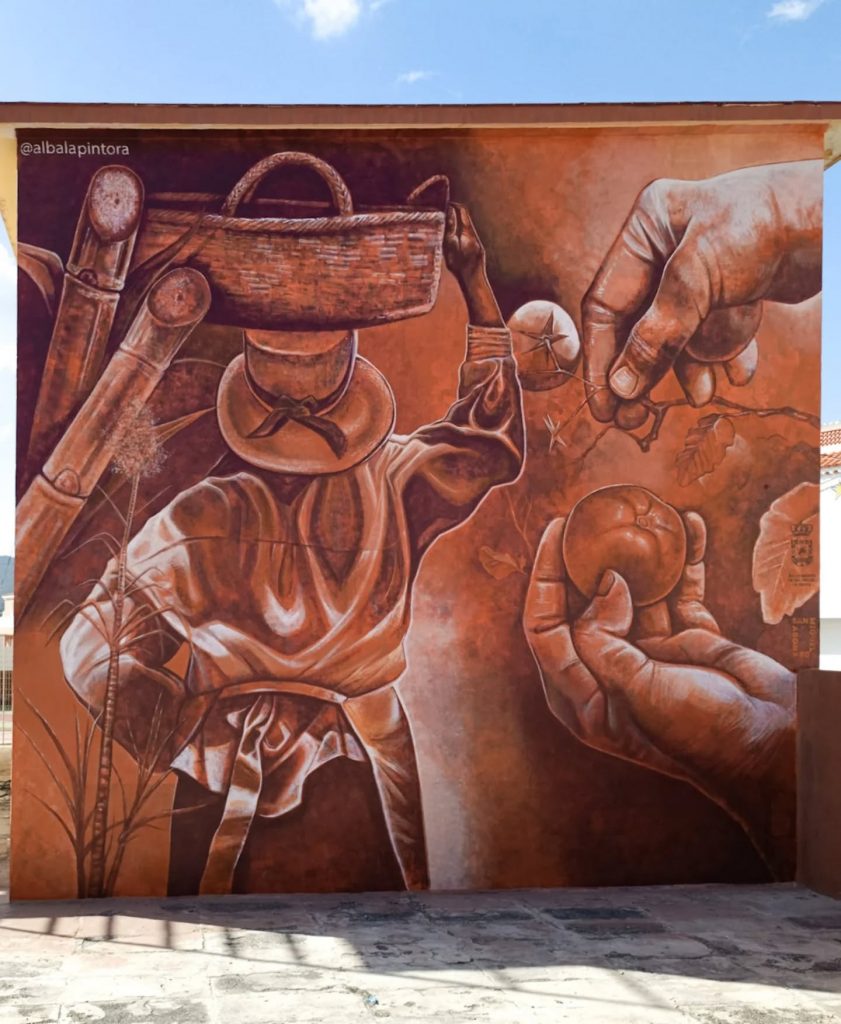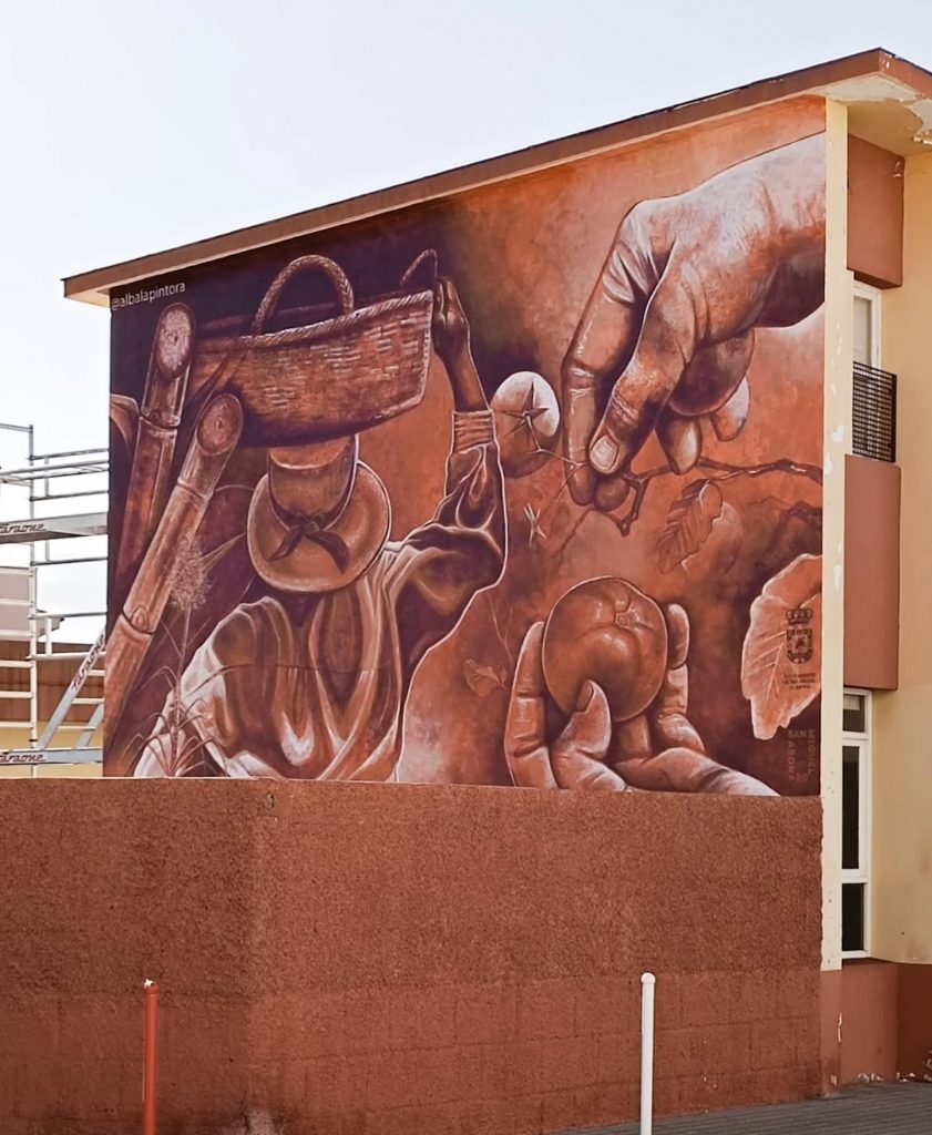 Mural en el antiguo aulario del Colegio de Las Zocas, ahora centro Afate, representando la tradición agrícola de la zona y el papel de la mujer en esta. Encargo del Ayuntamiento de San Miguel de Abona.