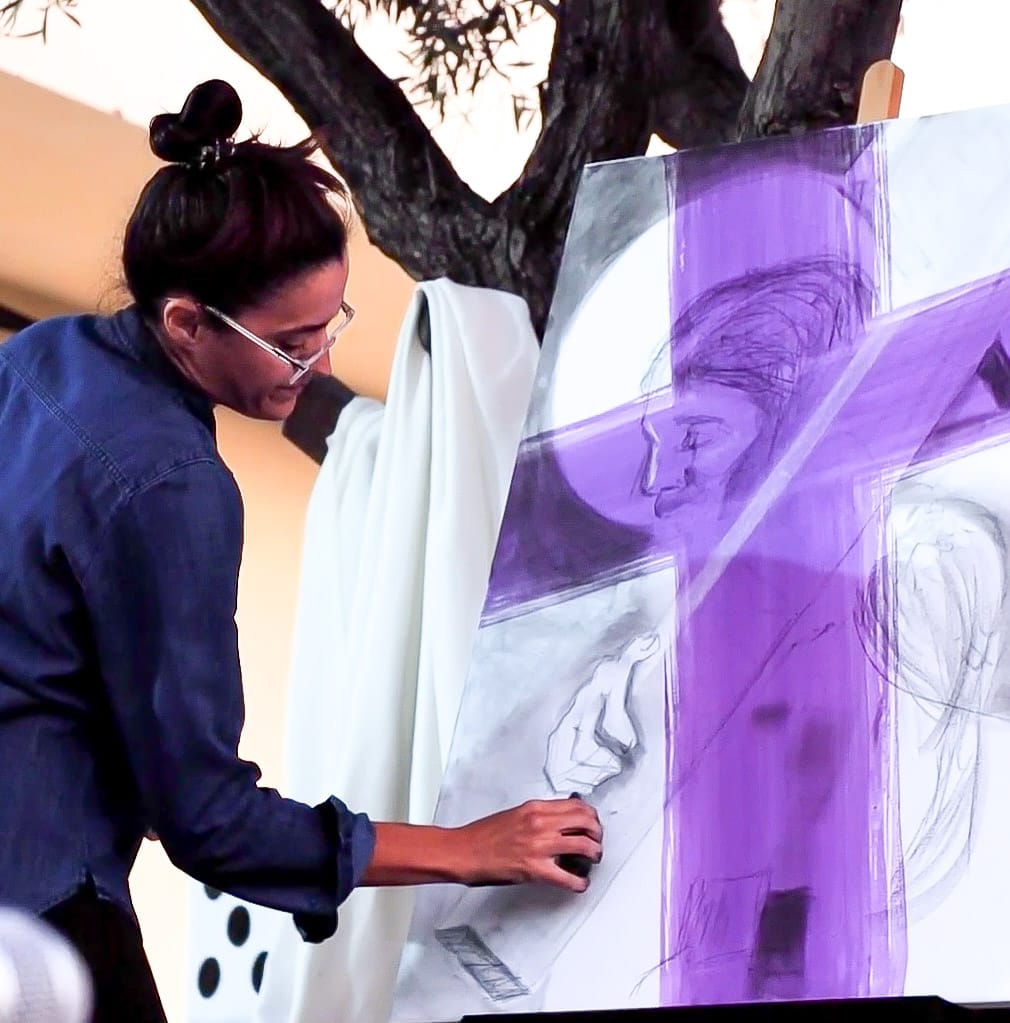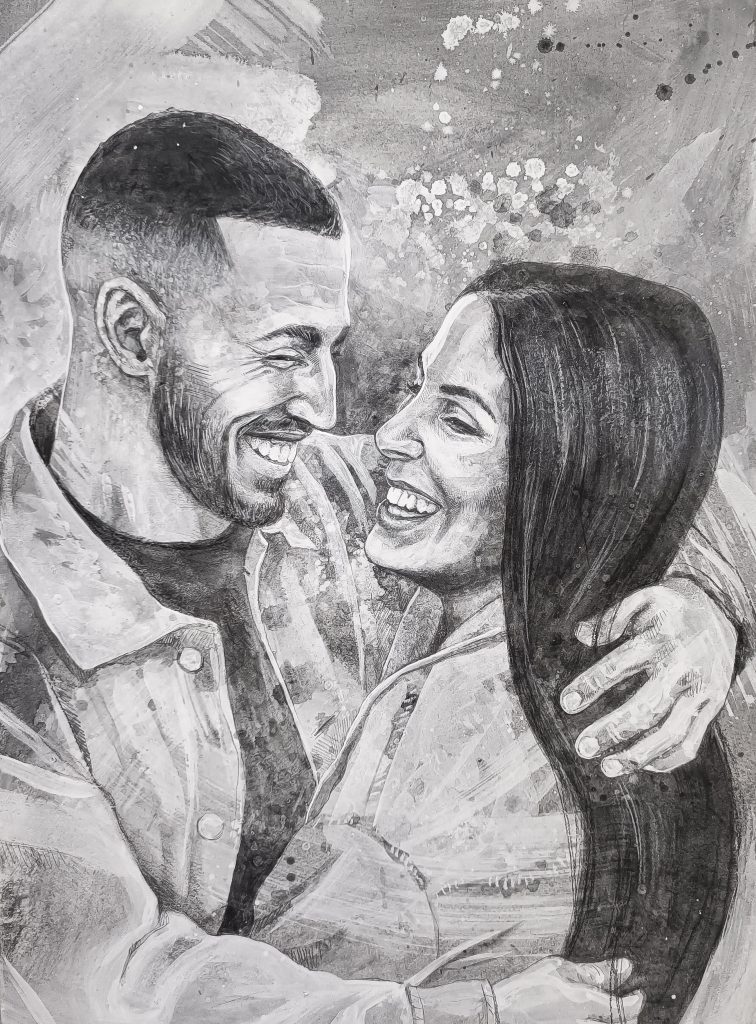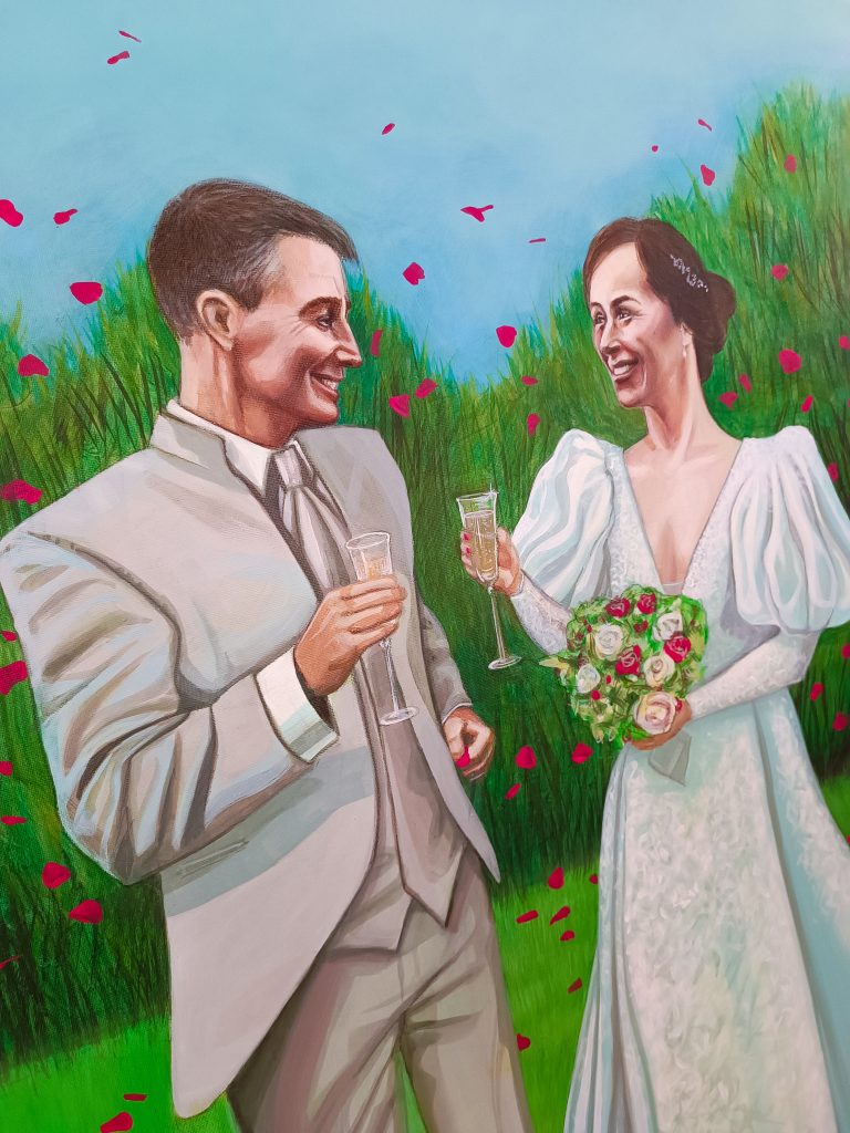 Al realizar una pintura rápida en vivo –durante un evento y ante una audiencia– el manejo del tiempo es esencial. Yo lo adaptaré a tus deseos, para que puedas disfrutar de la creación de una obra de arte en tiempo real en tu boda, celebración o evento. Aquí dos ejemplos: